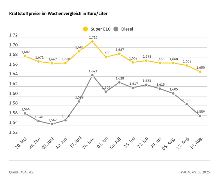 Die Kraftstoffpreise sind im Vergleich zur vergangenen Woche spürbar gesunken, wobei vor allem der Dieselpreis deutlich nachgegeben hat. Die aktuelle ADAC Auswertung der Kraftstoffpreise in Deutschland zeigt, dass der Preis für einen Liter Super E10 binnen Wochenfrist um 1,3 Cent zurückgegangen ist und jetzt bei durchschnittlich 1,650 Euro liegt. Diesel hat sich sogar um 2,4 Cent verbilligt und kostet aktuell 1,559 Euro.