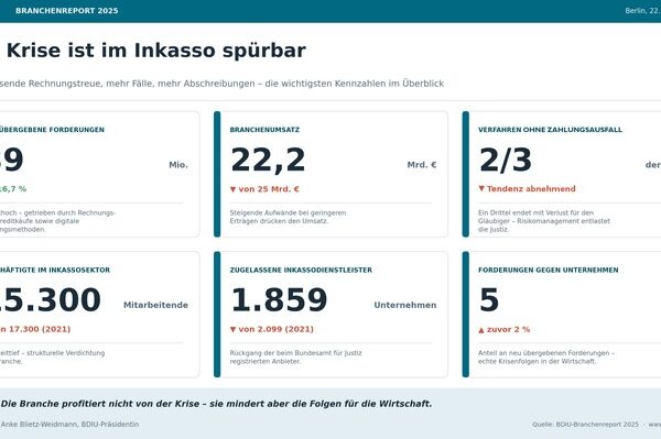 BERLIN (ots) – Laut Branchenreport 2025 des Bundesverbands Deutscher Inkasso-Unternehmen e. V. (BDIU) war der Bedarf an rechtlicher Beratung durch…
