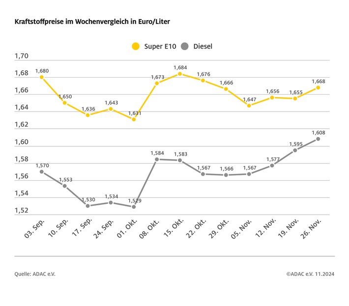 Aus Sicht des ADAC ist das derzeitige Preisniveau von Super E10 trotz der Verteuerung angemessen. Ein Blick auf die Preisauswertung vor vier Wochen zeigt einen nahezu identischen Benzinpreis (29.10.2024: 1,666 Euro je Liter Super E10) und das bei einem damals etwas geringeren Rohölpreis und einem deutlich stärkeren Euro. Aktuell rangiert der Preis für Rohöl der Sorte Brent bei etwa 73 US-Dollar, der Euro kostet rund 1,05 US-Dollar. Je niedriger der Ölpreis und je stärker der Eurokurs im Vergleich zum US-Dollar, desto günstiger sollte der Preis der Kraftstoffe an den Tankstellen ausfallen.