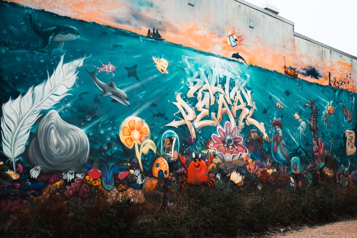Wie erfolgreich das sein kann, zeigt ein Besuch in Kiel. An einem regenverhangenen und trüben Tag wirkt das riesige Graffiti an der Hauswand eines Spielplatzes wie ein Akku für Augen und Seele. Auf knapp 100 Quadratmetern fügen sich maritime Motive zu einem Gesamtbild zusammen, das an eine Mischung aus Fluch der Karibik und einer comichaften Darstellung aller tierischen Bewohner der nahen Ostsee erinnert. Das Bild am Spielplatz Lerchenstraße ist ein Gemeinschaftsprojekt von ortsbekannten Graffitikünstlern und dem Verein Trauernde Kinder Schleswig-Holstein.
