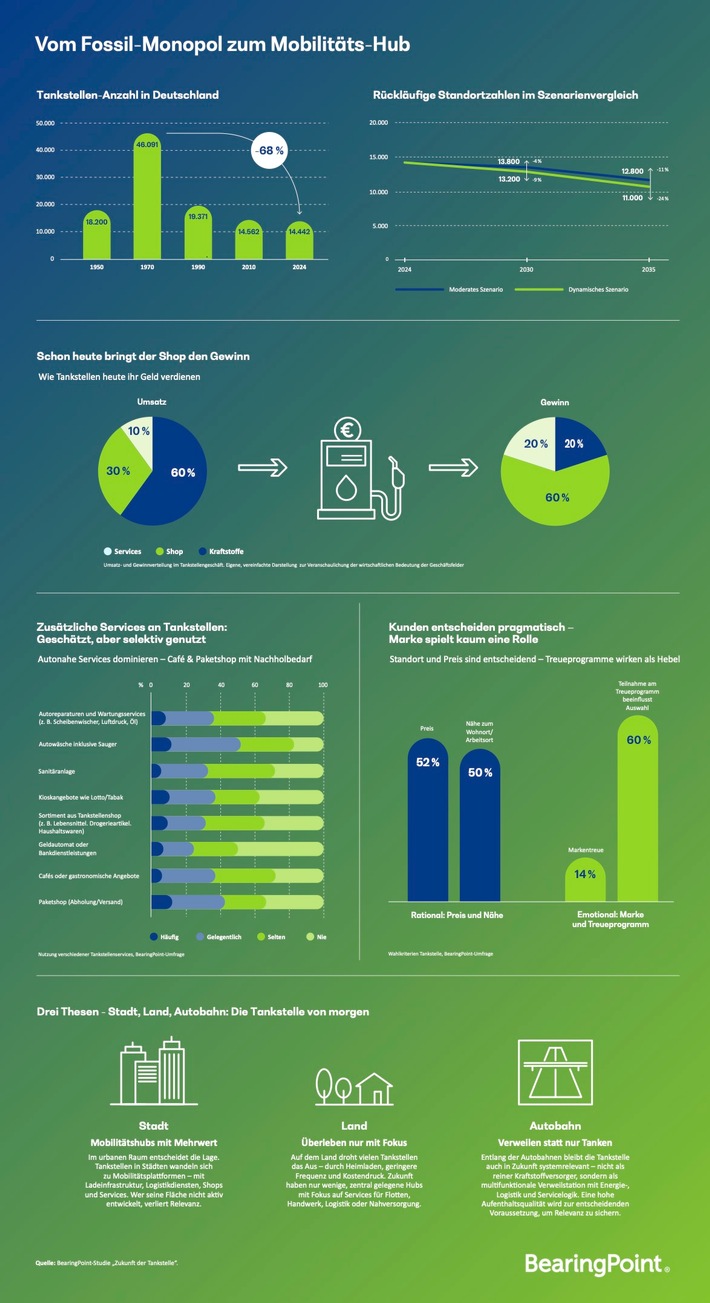 „Die Frage ist nicht mehr, ob sich die Tankstelle verändern muss, sondern wie schnell und in welche Richtung“, erklärt Nina London, Partnerin bei BearingPoint. „Erfolgreiche Betreiber werden sich vom reinen Kraftstoffanbieter zum integrierten Mobilitätsdienstleister entwickeln, der Ladeinfrastruktur, digitale Services und neue Geschäftsmodelle intelligent kombiniert.“