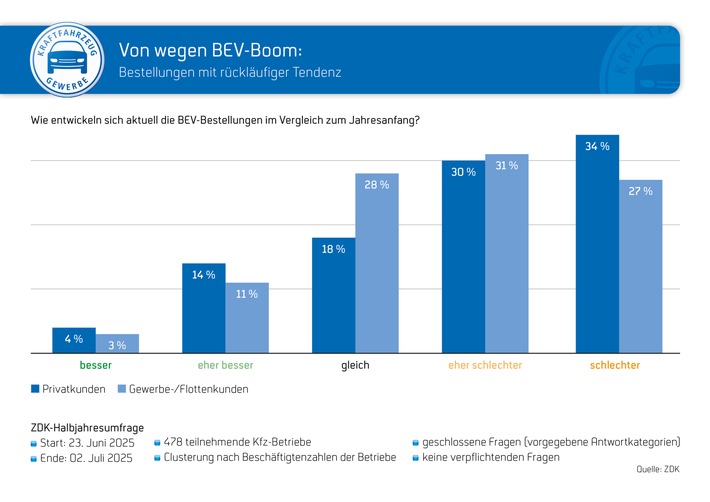 „Die Geschäftssituation vieler Autohäuser und Kfz-Betriebe ist deutlich angespannter, als es die offizielle Zulassungsstatistik vermuten lässt. Die wachsende Zahl an BEV-Neuzulassungen täuscht über die Realität im Handel hinweg“, erklärt ZDK-Präsident Thomas Peckruhn (https://www.kfzgewerbe.de/wir-ueber-uns/vorstand/thomas-peckruhn-praesident). „Was statistisch als Erfolg erscheint, ist in der Realität häufig das Ergebnis von Eigenzulassungen durch Hersteller und Händler, Flottengeschäften oder taktischen Maßnahmen – nicht aber von echten Kundennachfragen im Handel.“