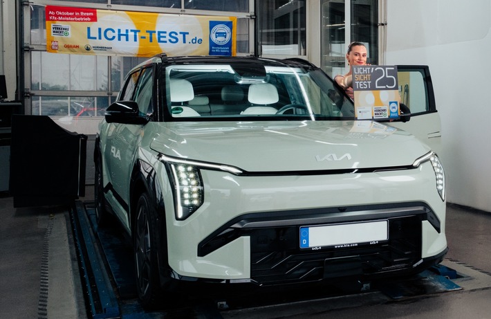„Gutes Licht! Gute Sicht!“ ist das Motto des Licht-Sicht-Tests 2025. Autofahrende können ab Oktober wieder ihre Fahrzeugbeleuchtung in Autohäusern und Kfz-Werkstätten überprüfen lassen, um sicher durch die dunkle Jahreszeit zu kommen. Kia Deutschland ist Autopartner dieser großen Verkehrssicherheitsaktion, durchgeführt vom Kraftfahrzeuggewerbe und der Deutschen Verkehrswacht. Schirmherr ist Bundesverkehrsminister Patrick Schnieder. Hauptpreis für alle, die zum Licht-Sicht-Test fahren und am Gewinnspiel teilnehmen, ist mit dem Kia EV3 erstmals ein E-Fahrzeug. Es wird dem Gewinner/der Gewinnerin im Rahmen des Automietservices „Kia Drive“ für die Dauer von zwölf Monaten bereitgestellt.