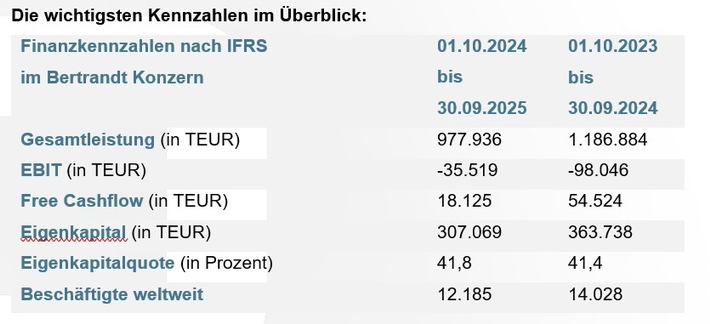 Die Gesamtleistung im Bertrandt Konzern sank im Geschäftsjahr 2024/2025 um rund 18 Prozent auf 978 Millionen Euro (Vorjahr 1,187 Milliarden Euro). Das EBIT in Höhe von rund -36 Millionen Euro (Vorjahr -98 Millionen Euro) hat sich vor dem Hintergrund spürbar positiver Effekte des Ergebnisoptimierungsprogramms deutlich gegenüber dem durch Sonderaufwendungen belasteten Vorjahreswert verbessert. Das bereinigte EBIT lag im Geschäftsjahr 2024/2025 bei -2 Millionen Euro. Hierzu hat auch ein wieder positives EBIT im vierten Quartal 2024/2025 beigetragen. Der Personalbestand wurde an die Marktbedarfe angepasst und reduzierte sich um 1.843 auf 12.185 Mitarbeitende zum 30. September 2025 (Vorjahr: 14.028). Trotz der anspruchsvollen Rahmenbedingungen konnte in der Berichtsperiode ein deutlicher positiver Free Cashflow in Höhe von rund 18 Millionen Euro erzielt werden. Auch die Bilanz stellt sich mit einer Eigenkapitalquote von über 40 Prozent als solide dar.