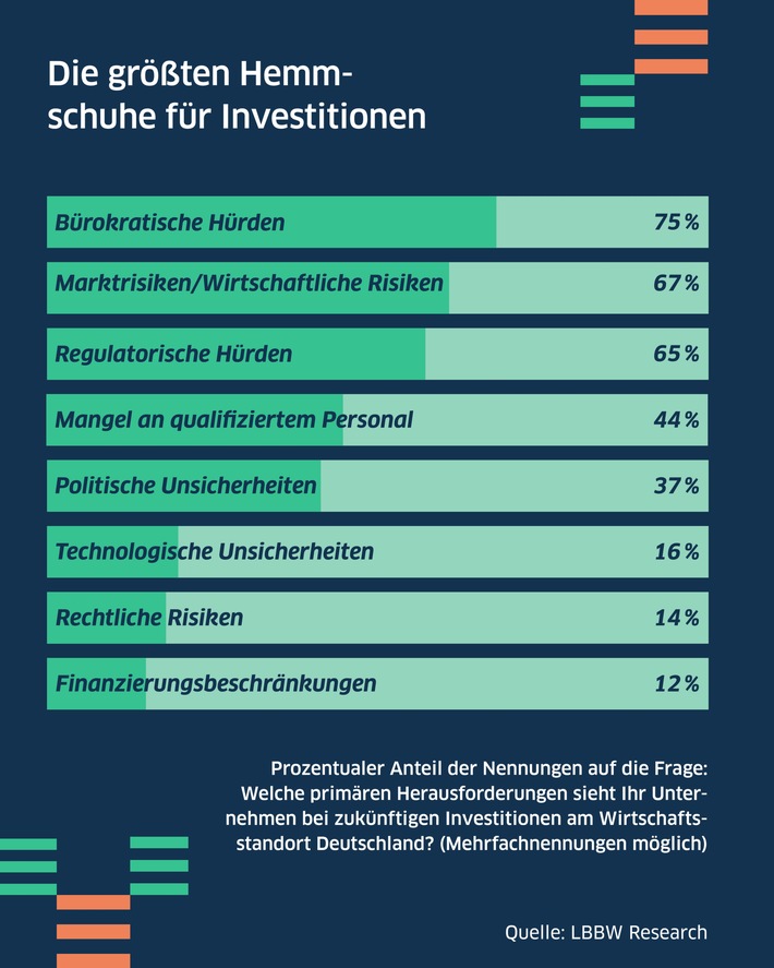 „Unsere Kundinnen und Kunden senden ein klares Signal: Sie wollen investieren und weiter wachsen“, so Joachim Erdle, im LBBW-Vorstand zuständig für das Unternehmenskundengeschäft. „Doch vor allem die Unsicherheit in den Rahmenbedingungen und die damit mangelnde Planungssicherheit sowie die ausufernde Bürokratie verhindern die Umsetzung.“