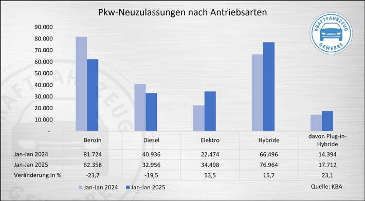 „Ein Anstieg der reinen Elektrozulassungen um die Hälfte gegenüber dem Vorjahresmonat ist kein Anlass zur Freude – die Zahlen täuschen über die wahre Situation der aktuellen Entwicklung hinweg,“ kommentiert Thomas Peckruhn, Vizepräsident des Zentralverbandes Deutsches Kraftfahrzeuggewerbe (ZDK) die heute vom KBA veröffentlichten Zulassungszahlen für den Januar 2025. „Um die CO2-Flottenziele, die ab diesem Jahr gelten zu erreichen haben die Hersteller Zulassungen von Elektroautos, sowohl BEVs wie auch Hybride, vom letzten in dieses Jahr verschoben. Dies ist ein Sondereffekt, der unsere Auftragslage nicht widerspiegelt.“ Peckruhn erwartet daher einen erneuten Einbruch der Zulassungszahlen. „Erst im zweiten Halbjahr werden die Hersteller die Rabatte wieder deutlich anziehen, sollten die Strafzahlungen bestehen bleiben.“