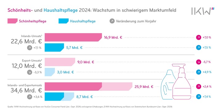Kosmetika und Haushaltspflegeprodukte stehen auch 2024 ganz oben auf den Einkaufslisten der Verbraucherinnen und Verbraucher. Der Einzelhandelsumsatz dieser Produkte steigt um 3,6 Prozent auf 34,6 Milliarden Euro, wie der Industrieverband Körperpflege- und Waschmittel e. V. (IKW) auf Grundlage von Hochrechnungen meldet. Der Inlandsumsatz wächst um 7,1 Prozent auf 22,6 Milliarden Euro, während der Exportumsatz um 3,3 Prozent auf 12,0 Milliarden Euro zurückgeht. Trotz schwacher gesamtwirtschaftlicher Impulse und gestiegener Belastungen hält die Branche ihren stabilen Wachstumskurs. Hohe Kosten und zunehmende Bürokratie schmälern jedoch die Investitionsspielräume und bedrohen die Wettbewerbsfähigkeit der stark mittelständisch geprägten Industrie.
