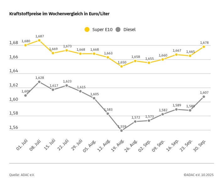 Günstigster Tag zum Tanken war bei beiden Sorten der Monatserste, teuerster Tag war jeweils der 30. September. Super E10 kostete am 1. September 1,654 Euro je Liter und verteuerte sich bis zum 30. September um 2,4 Cent auf 1,678 Euro. Der durchschnittliche Dieselpreis betrug am 1. September 1,569 Euro und kletterte bis zum 30. September um 3,8 Cent auf 1,607 Euro.