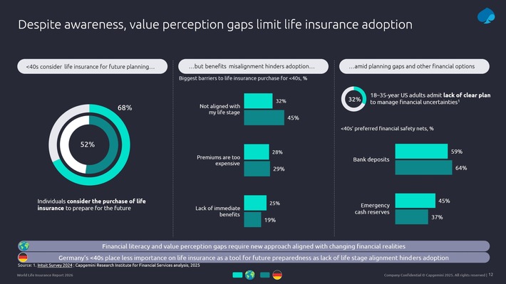 Der gemeinsam vom Capgemini Research Institute und LIMRA erstellte World Life Insurance Report 2026 (https://www.capgemini.com/insights/research-library/world-life-insurance-report/?utm_source=PR&utm_medium=Referral&utm_campaign=WLIR&utm_cre=IMG&utm_id=2025Aug13) zeigt, dass 68 Prozent der unter 40-Jährigen eine Lebensversicherung als entscheidend für eine sichere, finanzielle Zukunft betrachten. Allerdings passen die aktuellen Angebote nicht zu ihren finanziellen Prioritäten, weshalb solche Versicherungen selten abgeschlossen werden. Die Studie stellt fest, dass junge Verbraucher[1] einen kurzfristigen Mehrwert durch leicht zugängliche Leistungen erwarten, die in einer traditionellen Lebensversicherungspolice oft nicht enthalten sind. Obwohl einige Versicherer diese Vorteile bieten, lehnt jeder vierte Verbraucher Lebensversicherungen ab, wegen komplizierter Prozesse und Fachsprache, die Verständnis und die Nutzung der Policen erschweren.