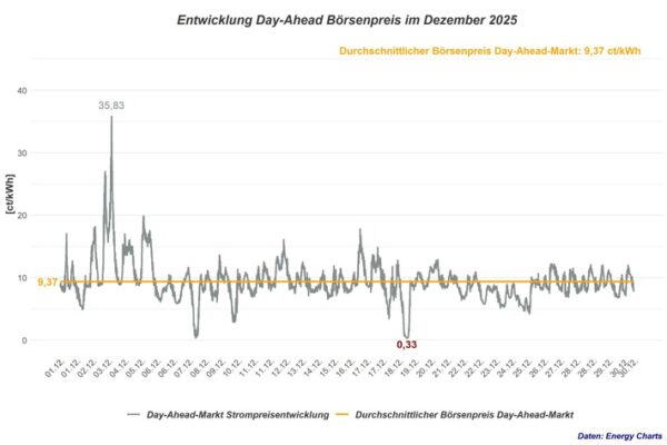 Hamburg (ots) – – Durchschnittlicher Börsenstrompreis im Dezember 2025: 9,37 ct/kWh, damit ist der Börsenstrompreis leicht gesunken. – Keine negativen…