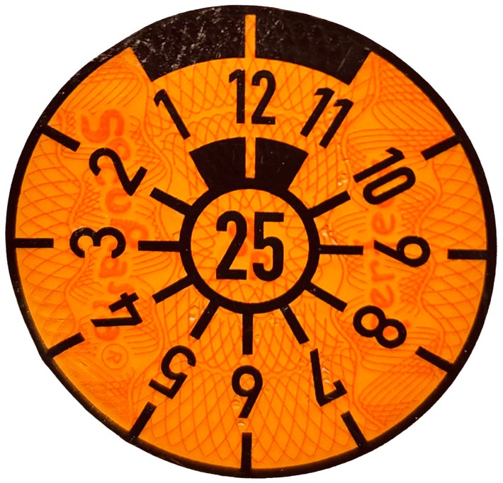 Die orangefarbenen Prüfplaketten mit der Zahl 25 auf den hinteren Kennzeichen von Autos, Anhängern, Motorrädern und anderen Kraftfahrzeugen laufen zum Jahreswechsel ab. In welchem Monat genau, das erkennt man an der Zahl, die nach oben zeigt – zum Beispiel 12 für den Dezember.