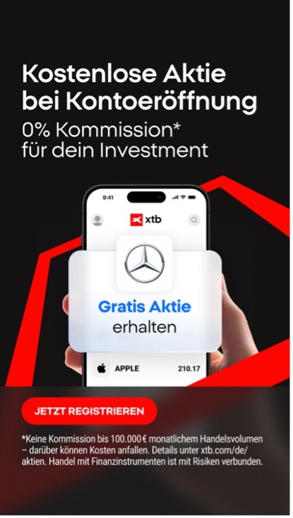 Der Online-Broker XTB reagiert auf die große Nachfrage und verlängert seine beliebte Sommeraktion. Ab sofort erhalten neue Kundinnen und Kunden, die ein Handelskonto eröffnen und eine beliebige Ersteinzahlung leisten, weiterhin eine kostenlose Mercedes-Benz Aktie (Wertpapierkennnummer 710000, die Aktie notiert am 15.08.2025 bei rund 53 Euro) Die Aktion läuft bis 31. Oktober 2025 oder solange der Vorrat von 4.000 Aktien reicht.